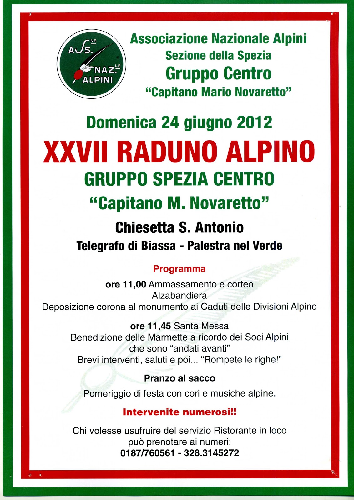Il 24 giugno tocca al Gruppo Spezia Centro fare festa e, come da tradizione, l'invito è di raggiungere la località Telegrafo, sopra l'abitato di Biassa, per trascorrere una giornata di allegria, magari godendosi un po' di fresco.