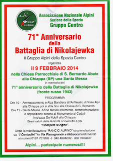Definito il programma della consueta commemorazione della battaglia di Nikolajewka, che quest'anno si svolgerà il giorno 9 febbraio. La novità è il luogo della manifestazione, che a differenza degli anni scorsi è un quartiere storico della nostra città, ossia alla Chiappa. La decisione assunta dal consiglio direttivo sezionale è finalizzata a rendere l'evento itinerante e non strettamente legato al centro città.