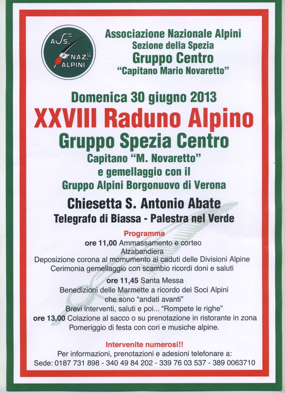 Il consiglio direttivo del Gruppo alpini Spezia Centro ha diffuso il programma definitivo della festa che si svolgerà il prossimo 30 giugno.