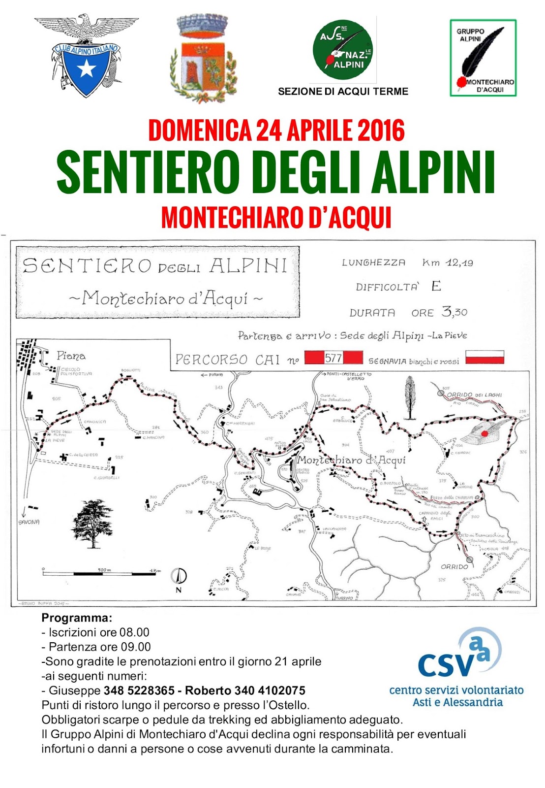 La sezione ANA di Acqui Terme, insieme al gruppo Alpini di Montechiaro d'Acqui, organizza per domenica 24 aprile 2016 una camminata naturalistica, alla scoperta delle peculiarità territoriali del piccolo borgo di Montechiaro. La camminata si svolgerà in una zona particolarmente ricca di boschi e verdi panorami, per una giornata alla scoperta di curiosità e affascinanti realtà naturalistiche. Sono gradite le prenotazioni, entro il 21 aprile, ai numeri 348 5228365 (Giuseppe) e 340 4102075 (Roberto). Obbligatori scarpe e abbigliamento adeguati.sabato 9 aprile 2016