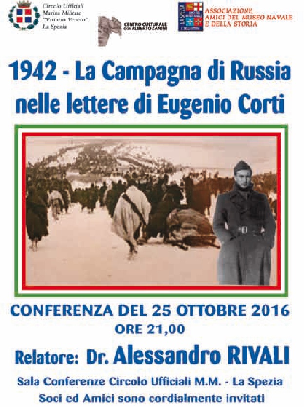 Martedì 25 ottobre a La Spezia, alle ore 21, presso il Circolo Ufficiali della Marina Militare "V. Veneto", il sig. Alessandro Rivali terrà una conferenza a titolo "1942 - La campagna di Russia nelle lettere di Eugenio Corti". L'inizio dell'incontro è previsto per le ore 21:00. L'organizzazione è a cura dell'Associazione Amici della Storia e del Museo Navale in in collaborazione con il Circolo Culturale Don Alberto Zanini.