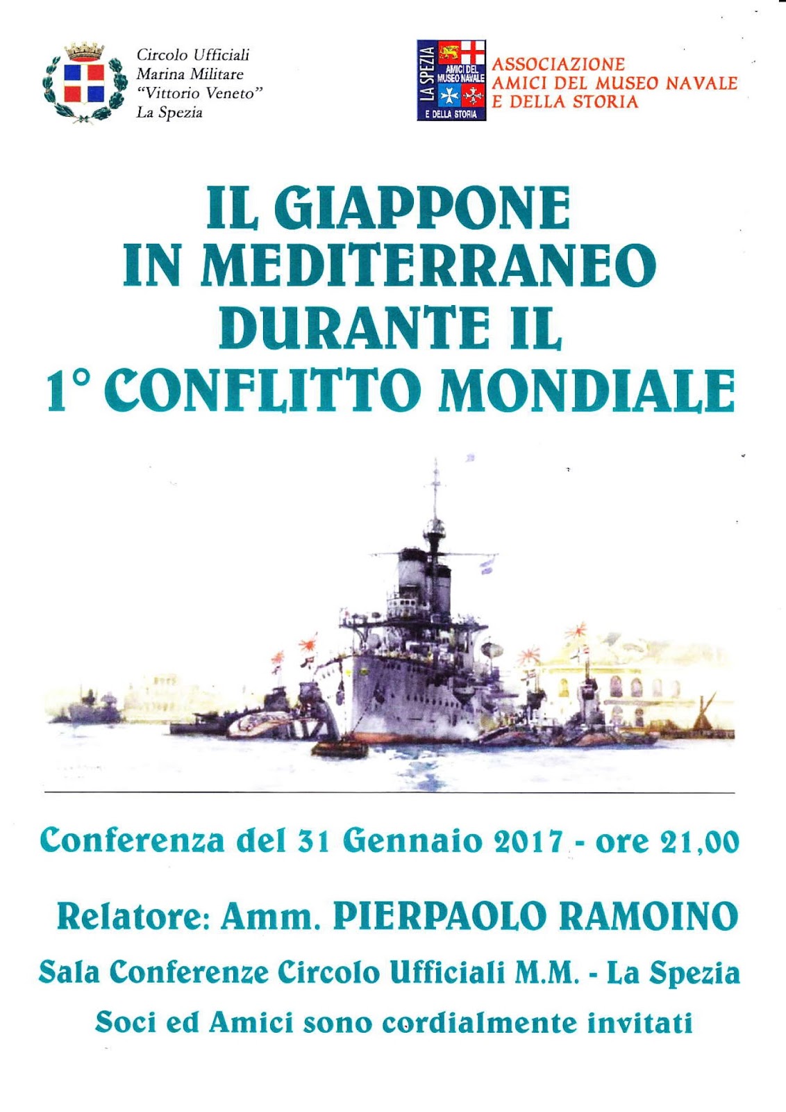 Martedì 31 gennaio a La Spezia, alle ore 21, presso il Circolo Ufficiali della Marina Militare "V. Veneto", l'Amm. Pierpaolo Ramoino terrà una conferenza dal titolo "Il Giappone in Mediterraneo durante il Primo conflitto mondiale". L'inizio dell'incontro è previsto per le ore 21:00. L'organizzazione è a cura dell'Associazione Amici della Storia e del Museo Navale.